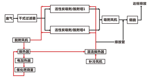 系統(tǒng)為固定床吸附+催化燃燒。主要由預(yù)處理裝置、活性炭沸石固定床、CO、安全裝置、風(fēng)機(jī)煙囪等組成。